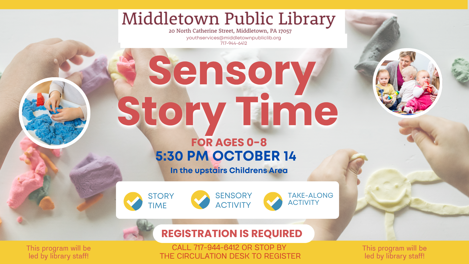 Sensory Story Time: Children ages infant to 8 are invited monthly on the third Tuesday to a sensory activity, story and take-along activity. Every third month the program will be led by Catherine Hershey School (September, December, March) All other dates will be lead by Library Staff.   Caring Hearts Pet Therapy program Tales with T.A.I.L.S. (Therapy Animals Increase Literacy Skills) seeks to improve children’s reading and communication skills with the assistance of registered therapy animal teams. The children are encouraged to read, engage, and connect with the pet. Bring your favorite book or two or choose one here at the library to share with one of our animal friends. Children will have the opportunity to read individually or in small groups with each of the animals at the session depending on the number of children registered and pets available. Animals are attentive . . . Read More » |