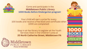 Register your pre-kindergarten children for the 1000 Books Before Kindergarten program. Every 100 Books, your child receives a prize and at 1000 they will receive a free book and certificate!
